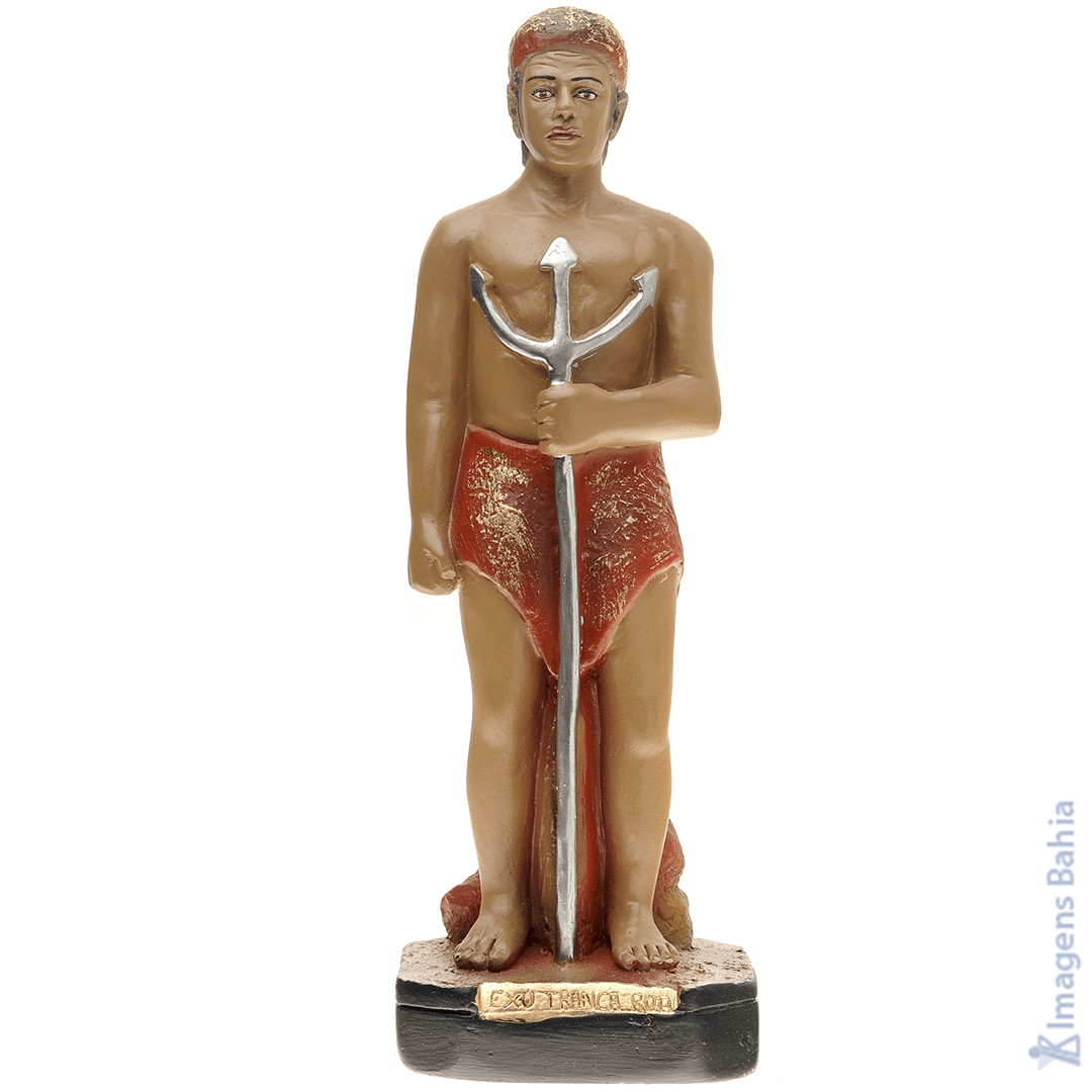 Imagem de Exu Tranca Rua em pé. Nós acreditamos que as imagens sacras têm o poder de proteger e guiar nossos caminhos. É por isso que colocamos tanto amor e dedicação em cada imagem que produzimos. Selecionamos cuidadosamente matérias-primas e trabalhamos artesanalmente para produzir cada imagem.